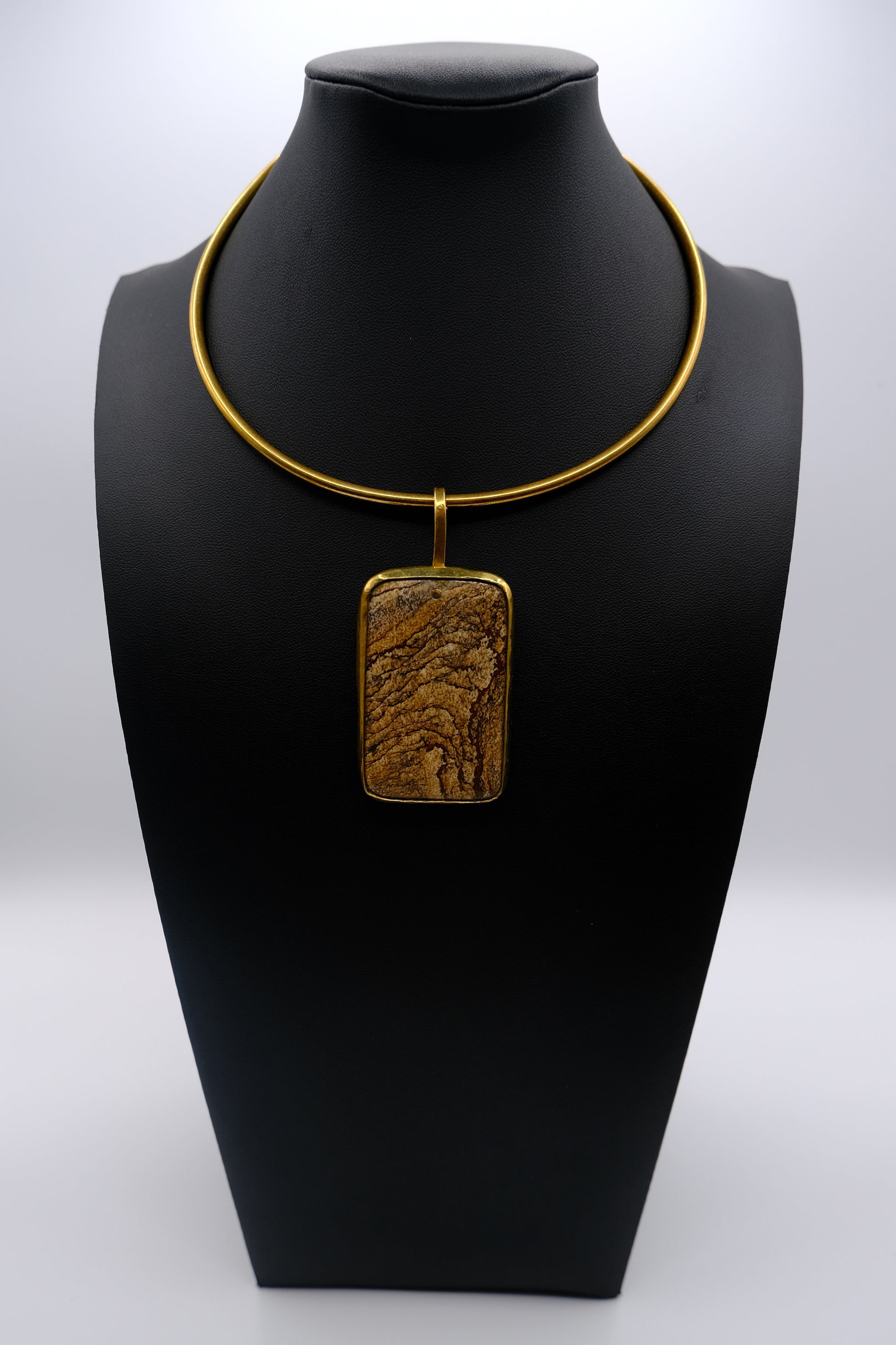 Embrace the raw beauty of nature with the Earthbound Choker, a stunning statement piece handcrafted in Kenya by skilled artisans. This striking choker features a Picture Jasper pendant encased in brass, with organic patterns reminiscent of rugged landscapes and desert sands. A symbol of grounding and wisdom, this piece carries the strength of the earth wherever you go.