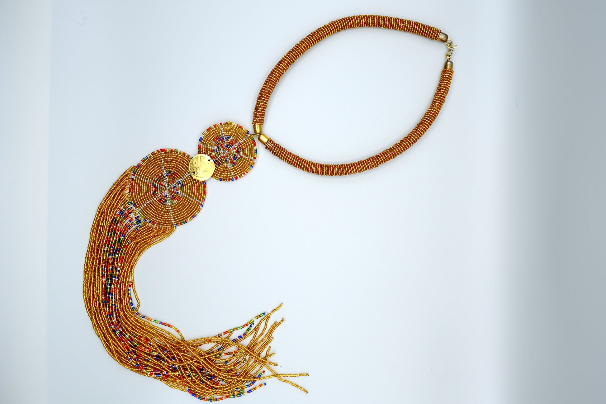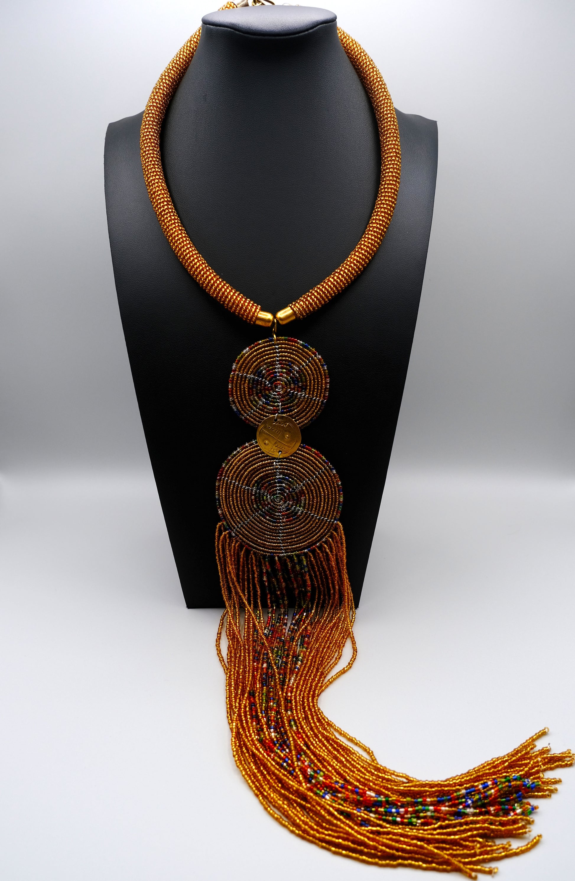 Honor the rich heritage of the Maasai people with the Enkai Dusk necklace, a stunning blend of tradition and modern artistry. Handcrafted by skilled Maasai artisans, this bold statement piece features a richly beaded rope choker in warm golden brown—symbolizing the earth, strength, and resilience in Maasai culture. Two concentric beadwork pendants, intricately woven with metallic and multicolored accents, are connected by a hand-hammered brass centerpiece, leading into a cascading fringe of golden and multicolored beads that create mesmerizing movement.