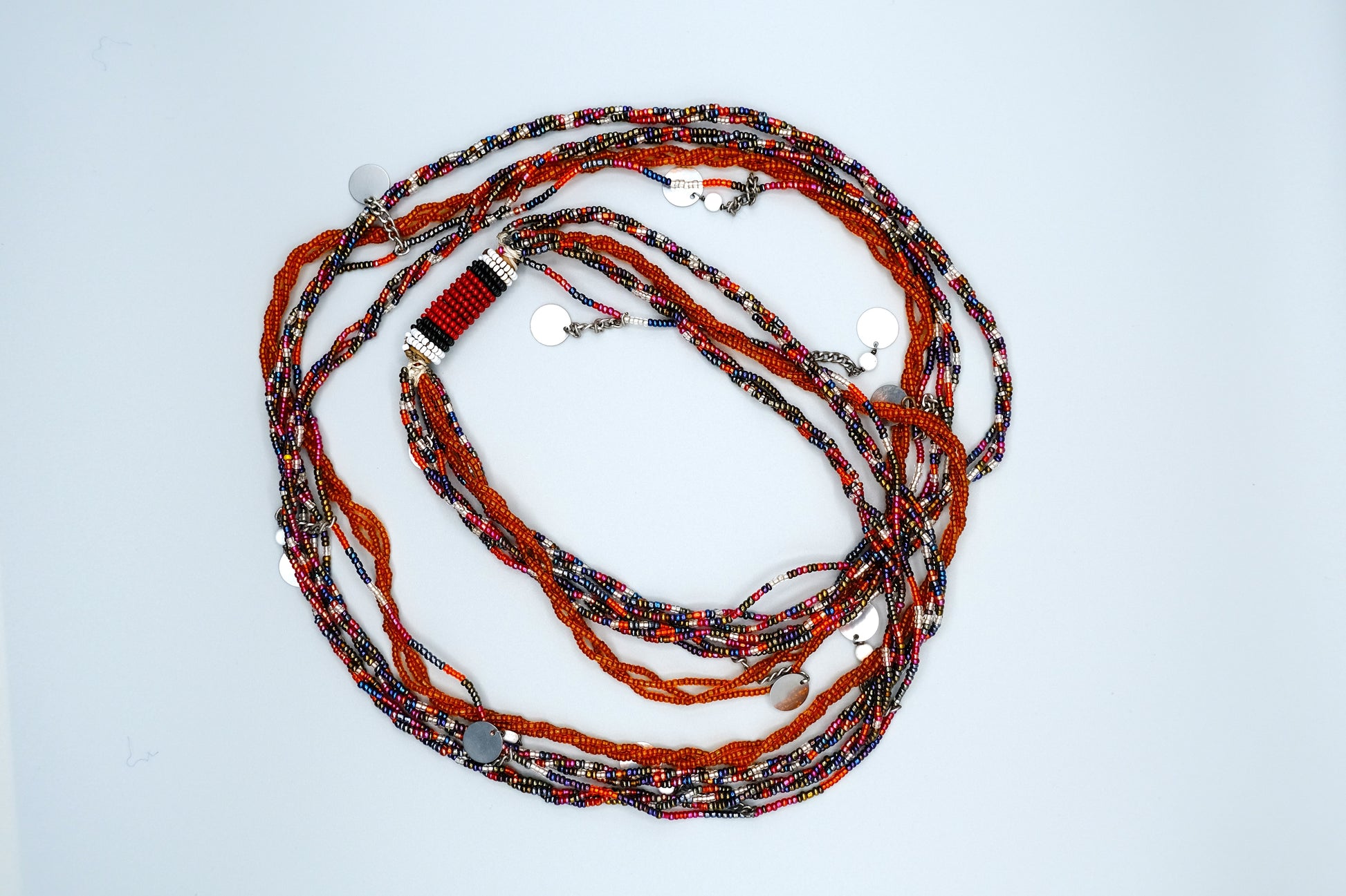 Honor the rich heritage of the Maasai people with the Enkai Horizon necklace, a captivating fusion of tradition and versatility. Handcrafted by skilled Maasai artisans, this multi-strand statement piece features an intricate layering of vibrant beads in deep earth tones, fiery reds, and bold blacks—symbolizing the vast African landscape, resilience, and strength. Delicate metallic accents and cascading coin charms add movement, depth, and a contemporary edge to this timeless piece.