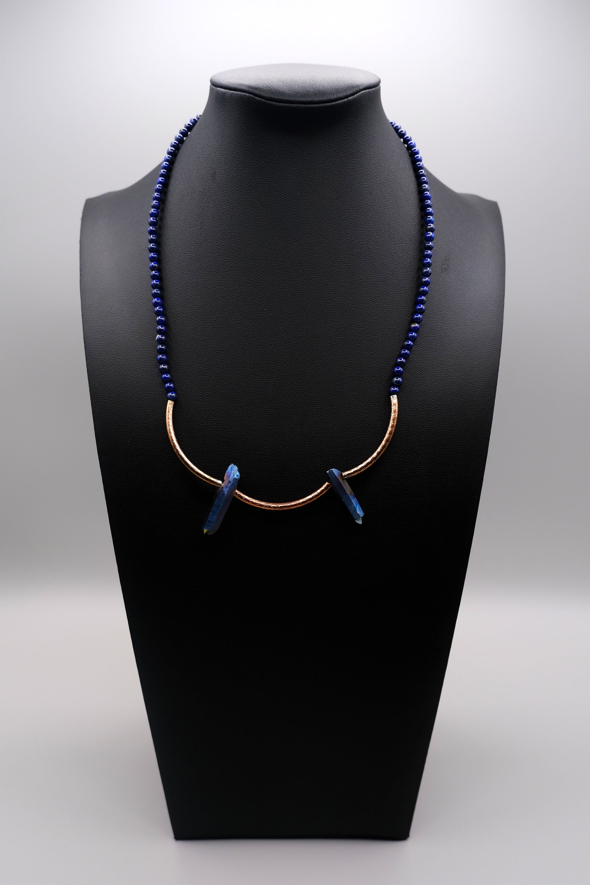 • Genuine semi-precious Lapis Lazuli beads and striking Blue Quartz crystals, uniquely formed by nature.