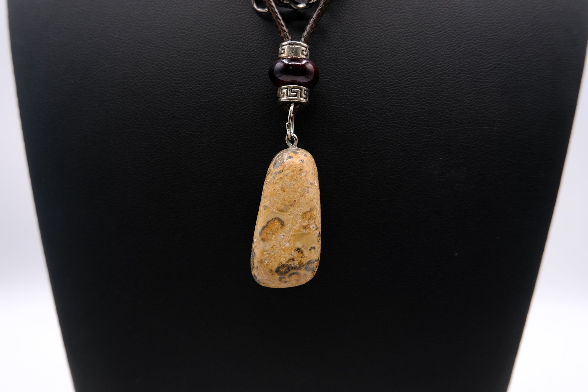 This necklace features a polished Yellow Jasper pendant, known for its golden, earthy tones and deep connection to strength and protection. The pendant is complemented by a deep brown wooden bead and intricate silver-toned Greek key-inspired accents, all strung on a durable 17-inch brown cord, blending rustic charm with timeless elegance.