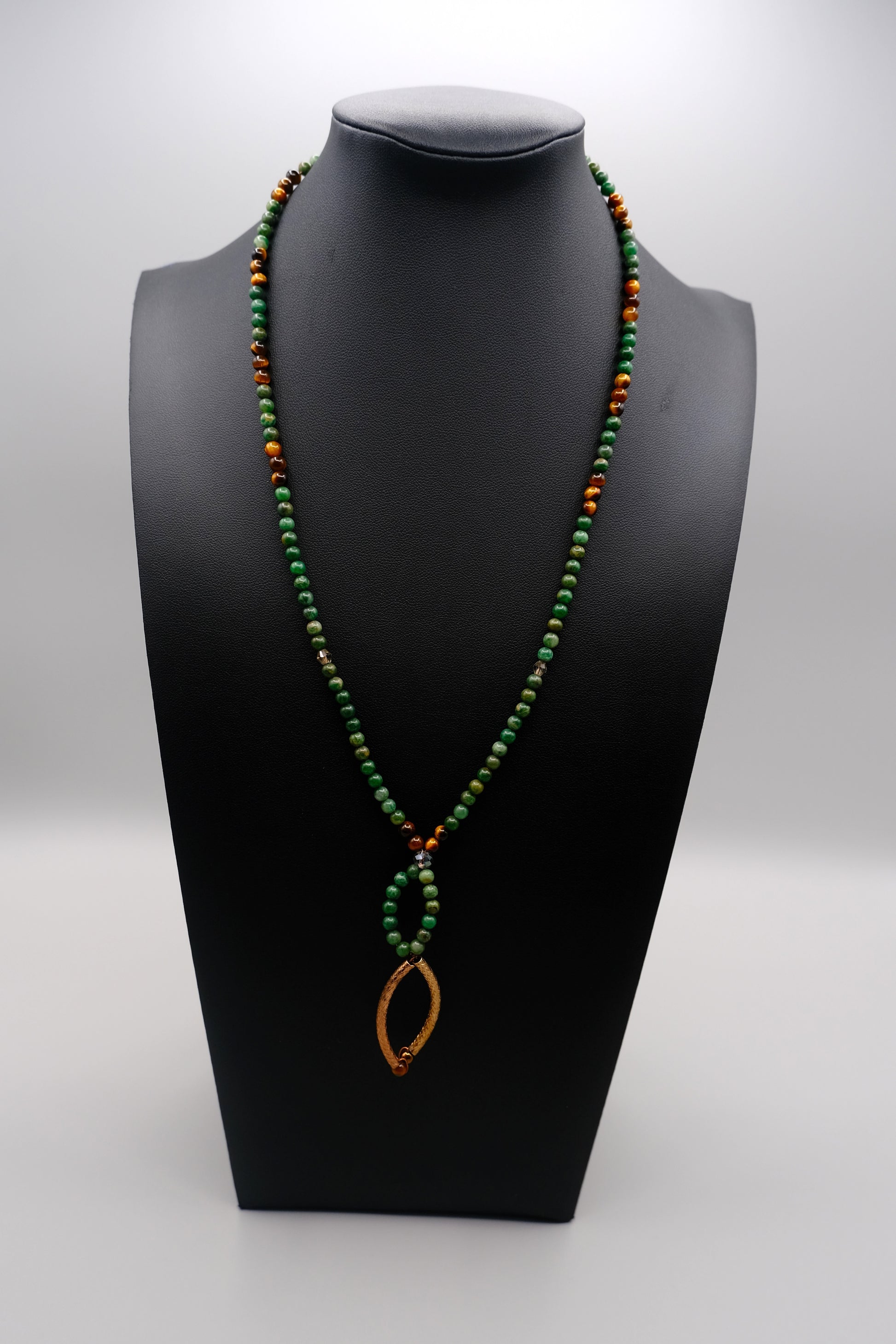 Reconnect with the grounding beauty of nature with the Kajiado Earth Necklace, intricately handcrafted by Maasai women artisans from Kajiado, Kenya. Featuring a harmonious blend of Green Aventurine and Tiger’s Eye stones thoughtfully arranged within resilient copper wire, each necklace tells a unique story of creativity and intention.
