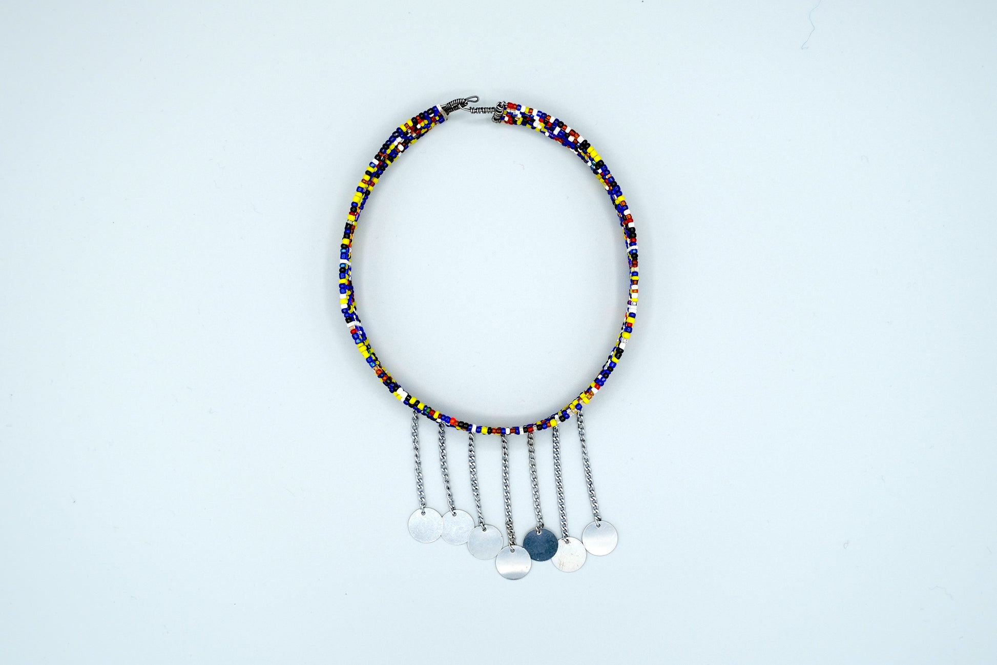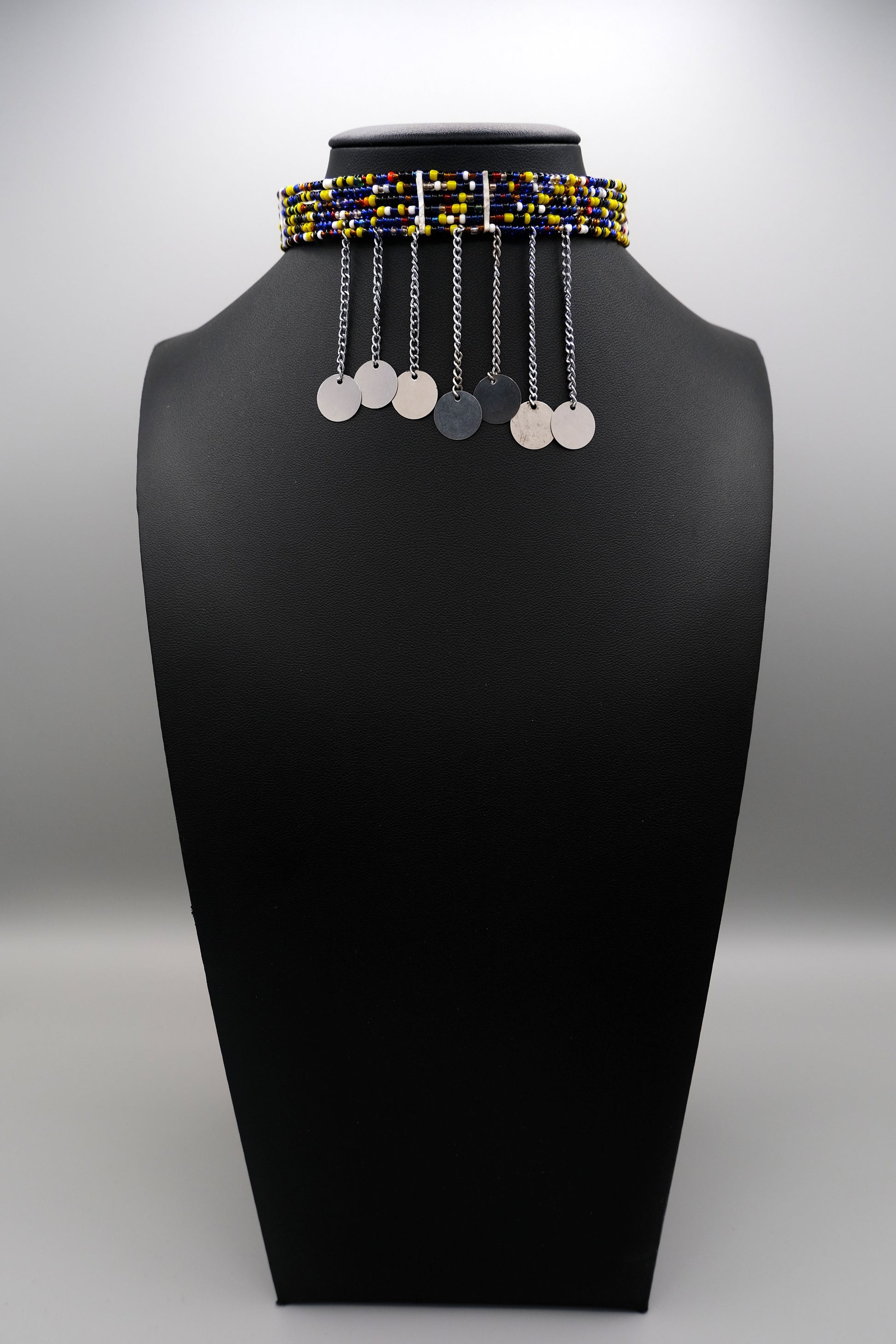 The Olamayio Warrior Choker is a striking tribute to the strength and honor of Maasai warriors. Handcrafted by Maasai artisans in Tanzania, this piece features a bold combination of deep blue, yellow, and red beading, symbolizing energy, resilience, and unity. The detailed beadwork is complemented by dangling silver discs, representing the rhythm of life and the warrior’s journey.
