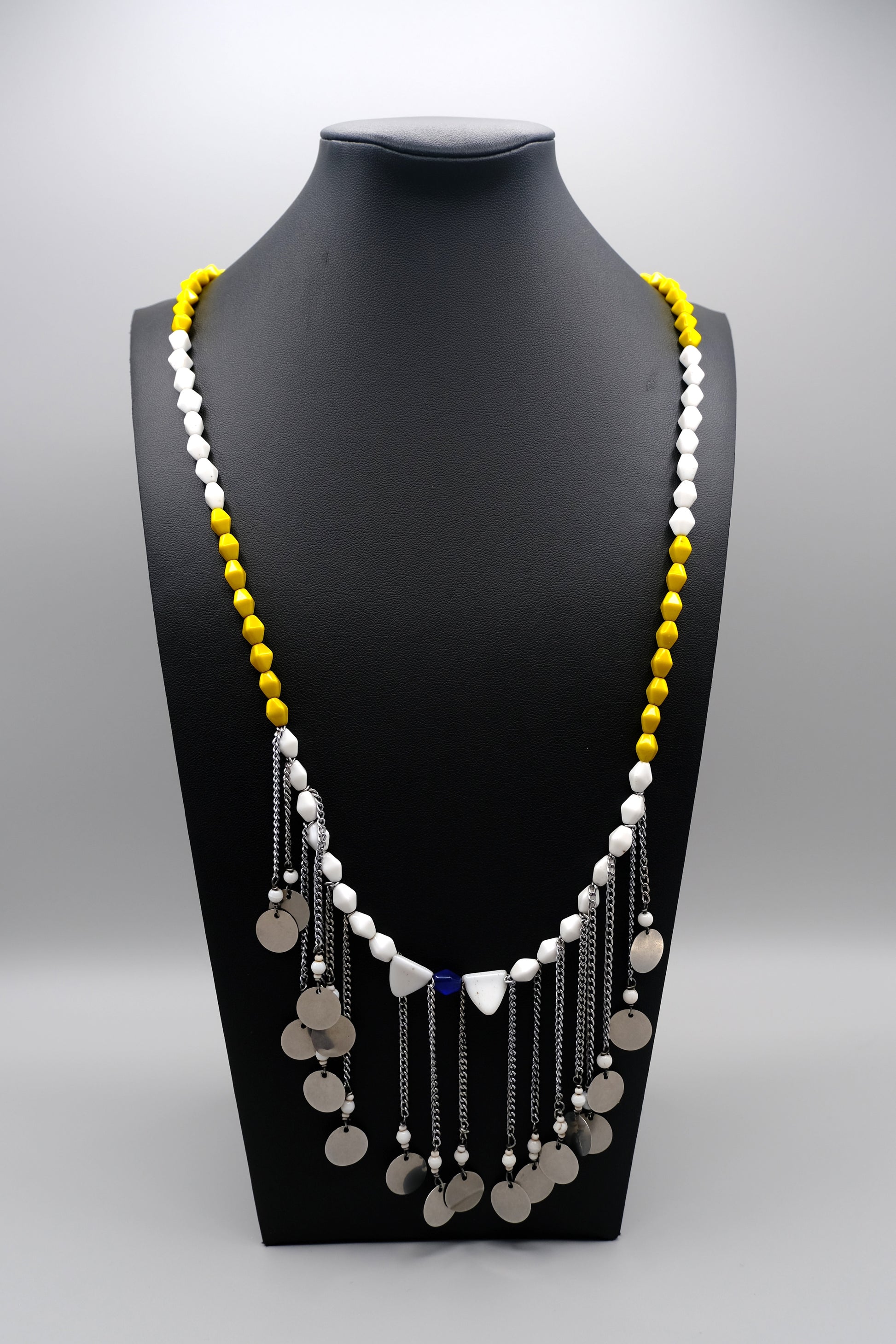 Illuminate your look with the Oloruka Sunlight Necklace, a stunning embodiment of Maasai heritage and celestial beauty. Handcrafted by skilled artisans in Tanzania, this piece features a striking combination of vivid yellow and pure white beads, symbolizing the warmth of the sun and the purity of light. Accentuated with delicate silver coin charms and cascading chains, it moves with grace, evoking the rhythm of nature and tradition.