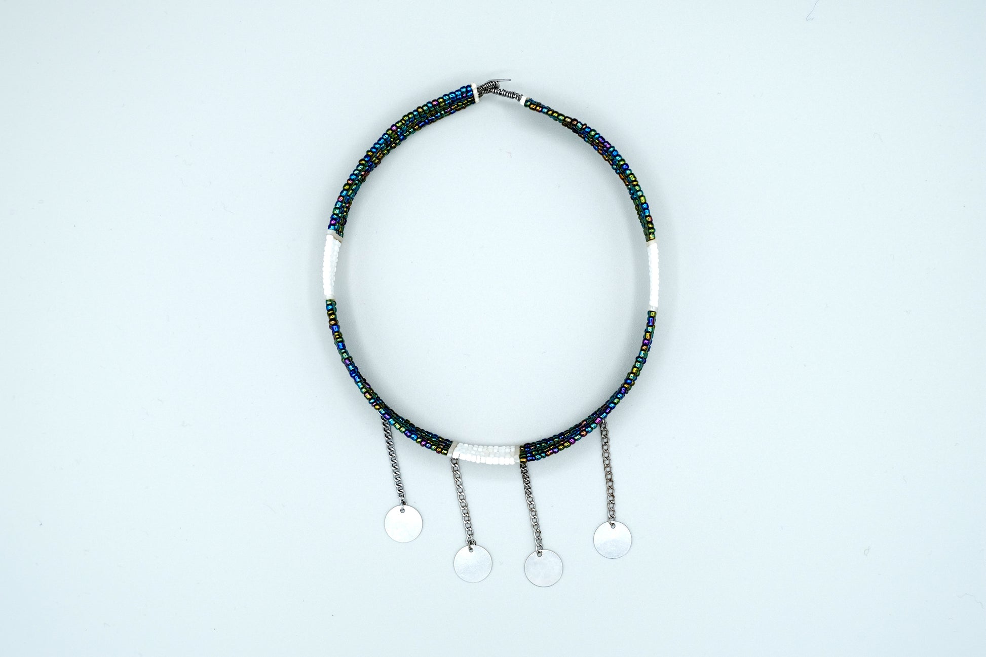Step into the elegance of the night with the Orkilili Nightfall Choker, a striking piece handcrafted by Maasai artisans in Tanzania. The deep, iridescent beadwork reflects the shifting colors of twilight, while the bold white accents symbolize clarity, wisdom, and protection. Dangling silver discs add movement, capturing the essence of resilience and grace.