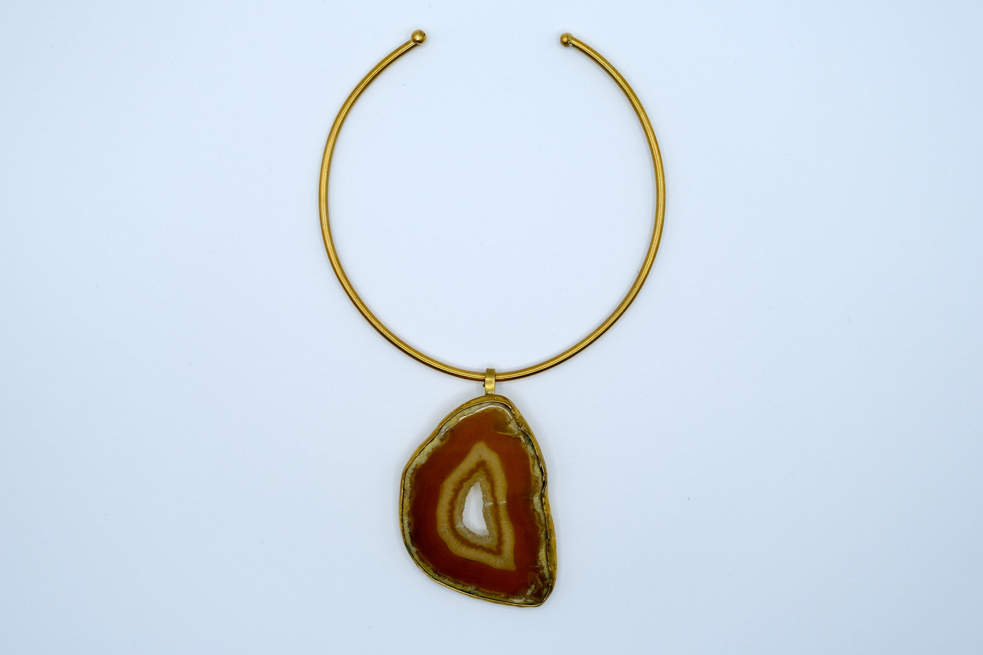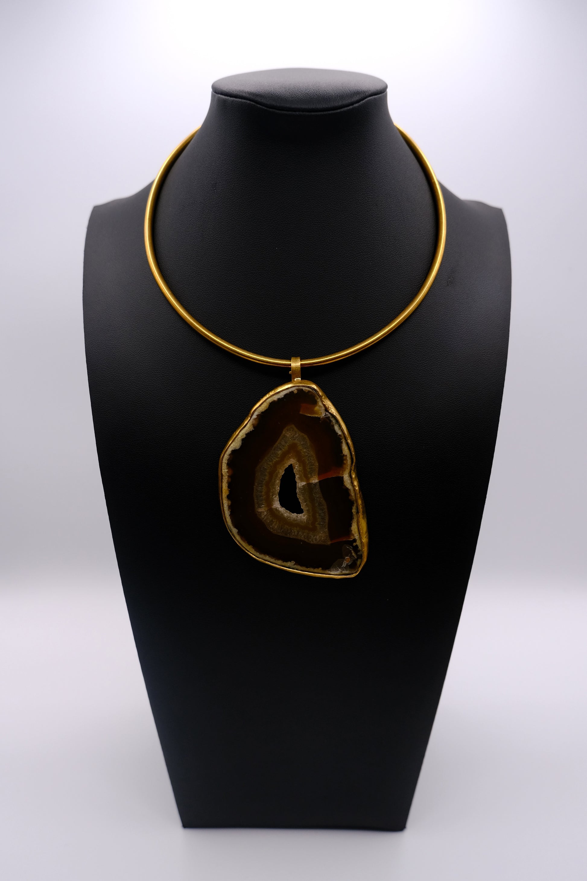 Radiate confidence and elegance with the Solar Aura Choker, a bold statement piece handcrafted by skilled artisans in Kenya. This striking choker features a natural Brown Agate pendant, beautifully encased in a hand-forged brass setting. The organic, raw beauty of the stone reflects the warmth and depth of the earth, making this choker a powerful symbol of grounding, strength, and protection.