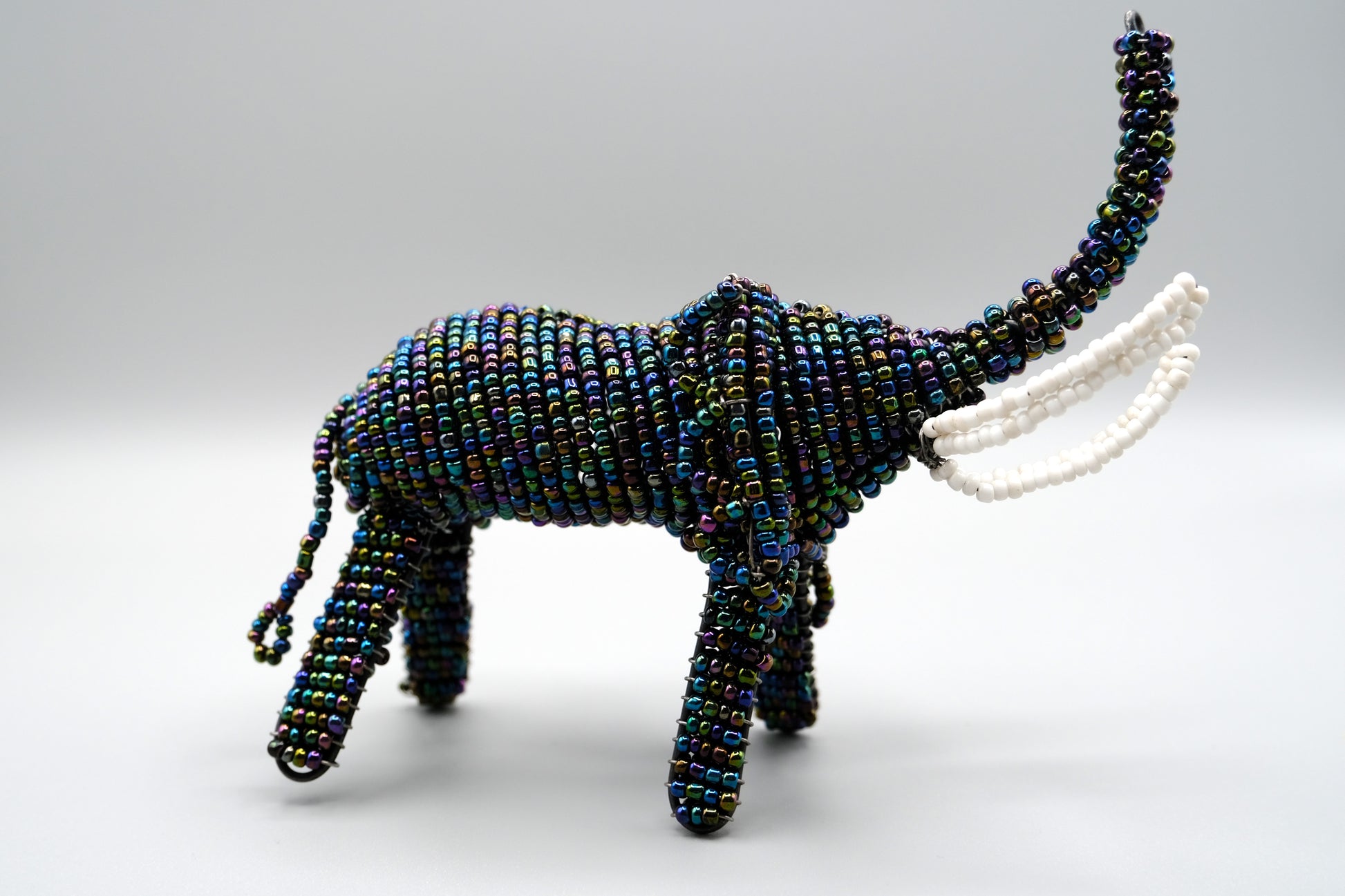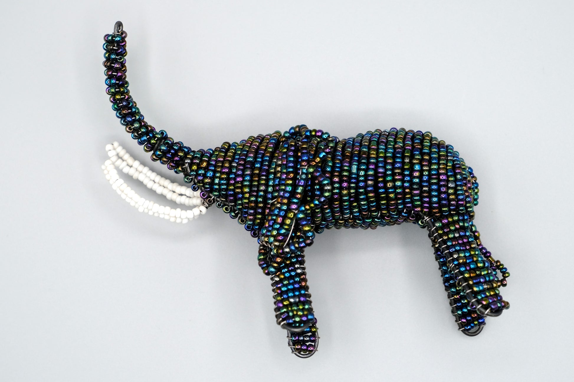 Celebrate the wisdom and majesty of Africa’s largest land mammal with the Tembo Twilight Beaded Elephant, an exquisite handcrafted piece created by Maasai women in Tanzania. This elephant features dazzling iridescent beads woven into a sturdy wire frame, with elegant white beaded tusks that highlight its regal presence.