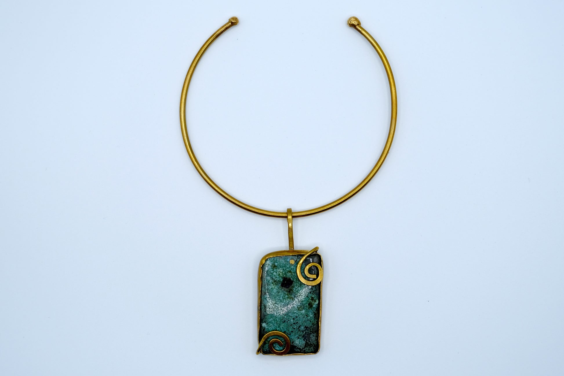Embrace transformation with the Verdant Spiral Choker, a bold statement piece handcrafted in Kenya by skilled artisans. Featuring a stunning African Turquoise stone encased in brass with delicate swirl accents, this choker embodies the beauty of evolution and wisdom. Its rich green hues with natural black and brown veining evoke the depth of the earth and the energy of growth.